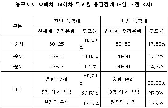 스포츠토토 공식 온라인 발매사이트인 베트맨(www.betman.co.kr)은 오는 9일 오후 5시 부천 실내체육관에서 열리는 2010-2011시즌 여자프로농구 신세계-우리은행전을 대상으로 한 농구토토 W매치 94회차 투표율을 중간 집계한 결과, 전체 참가자의 60.55%가 홈팀 신세계의 우세를 예상했다고 밝혔다.