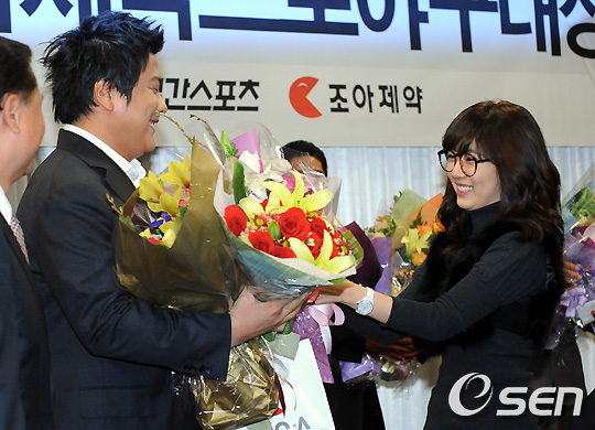 특별상을 수상한 김태균이 약혼녀 김석류 전 아나운서에게 꽃다발을 받고 있다. /soul1014@osen.co.kr