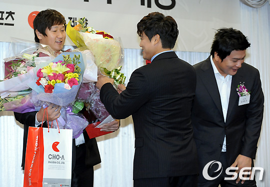이날 시상식에서 이대호가 대상을 수상하자 김태균과 홍성흔이 축하 꽃다발을 건네고 있다. /soul1014@osen.co.kr