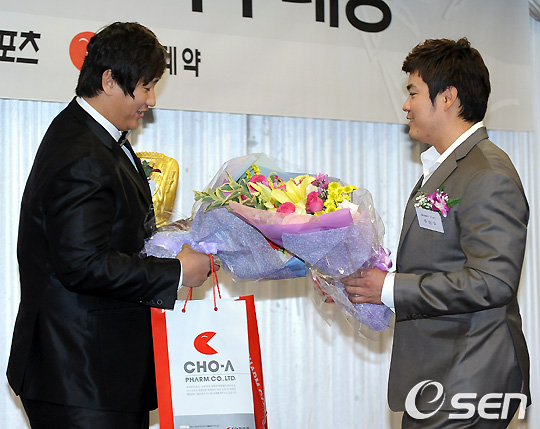 이날 시상식에서 이대호가 대상을 수상하자 추신수가 축하 꽃다발을 건네고 있다. /soul1014@osen.co.kr