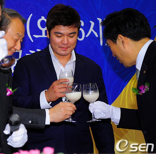 추신수가 유영구 KBO 총재, 강승규 대한야구협회 회장과 건배를 하고 있다./rumi@osen.co.kr