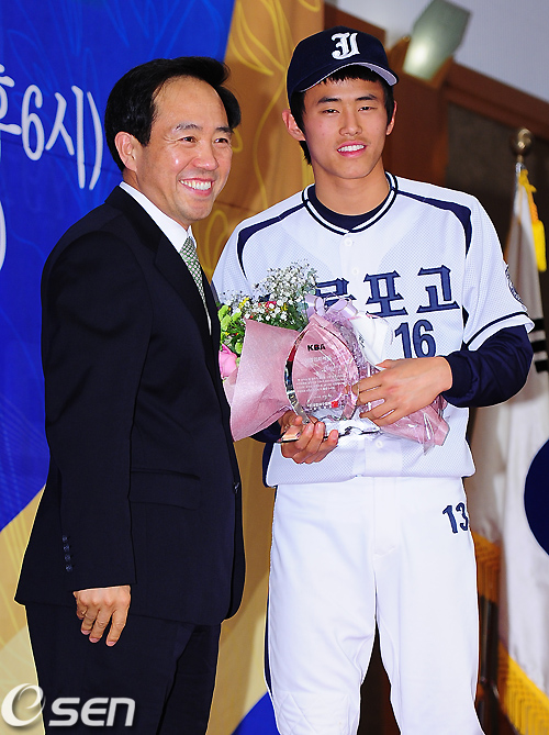 유재혁(제물포고)이 강승규 대한야구협회 회장으로부터 이영민 타격상을 수상하고 있다./rumi@osen.co.kr