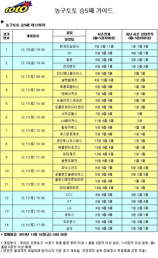 농구토토 승5패 12회차 게임은 1경기 한국인삼공사-SK전 시작 10분전인 10일 오후 6시 50분에 발매가 마감된다.