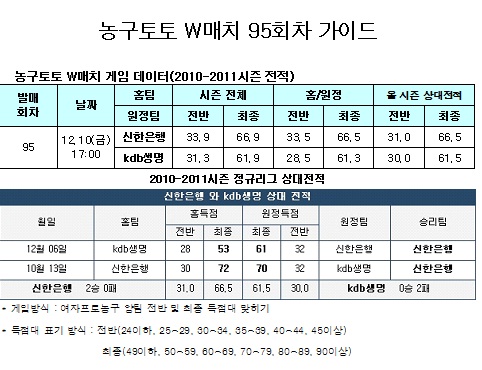 이번 농구토토 W매치 95회차 게임은 경기시작 10분 전인 10일 오후 4시 50분에 발매가 마감된다.
