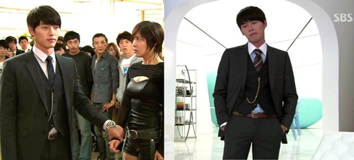 현빈의 수트룩은 깔끔하고 심플한 스타일이다. 특히 현빈은 무채계열의 수트에 푸른색계열의 셔츠와 스트라이프 패턴 넥타이를 매치해 시크한 느낌의 ‘까도남’ 느낌을 잘 표현하고 있다. 여기에 포인트 아이템으로 시계를 착용해 완벽한 수트 스타일을 선보이고 있다.