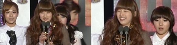 두 번째 주자는 수지다. 이날 수지는 드라마 '드림하이' 촬영 때문에 부득이하게 교복 차림으로 시상대에 올랐다. 본 무대에 서지 못하는 대신 수상 소감을 말하게 된 수지는 마치 많은 사람들 앞에 처음 서 본 고등학생을 보는 듯 어설프지만 귀여운 모습을 선보였다.