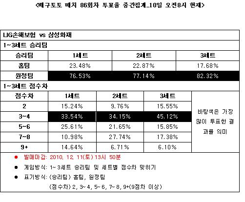 체육진흥투표권 수탁사업자인 오리온그룹의 스포츠토토 공식 온라인 발매사이트인 베트맨(www.betman.co.kr)은 오는 11일(토) 오후 2시에 구미 박정희체육관에서 열리는 2010-11시즌 국내프로배구 LIG손해보험-삼성화재전을 대상으로 한 배구토토 매치 86회차 게임 투표율을 중간집계한 결과, 원정팀 삼성화재의 압도적 승리가 예상됐다고 밝혔다.