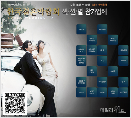 오는 12월 18일에서 19일까지 학여울역에 위치한 SETEC(서울무역전시관)에서 월간 웨딩21과 결혼대백과 웨프가 함께하는 '한국결혼박람회 명품전'이 개최된다.약 150여 결혼관련업체가 대거 참여하는 가운데 세텍 전시관에서 펼쳐지는 이번 행사의 컨셉트는 ‘2011 S/S 웨딩 혼수 트렌드 전’으로 2011년 봄여름 시즌의 결혼예물 트렌드를 한눈에 볼 수 있는 자리를 마련하였다고 한다. 예비신랑신부라면 한국결혼박람회를 통해 미리 꼼꼼히 챙겨 자신의 결혼비용과 취향, 그리고 양가 집안의 가풍을 고려하는 현명한 결혼예물을 선택 할 수 있는 기회가 될 수 있을 것으로 보인다.