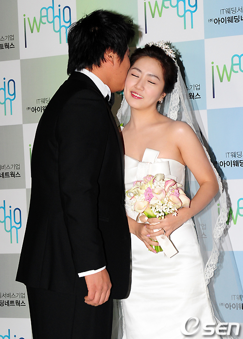 김태균이 신부 김석류의 볼에 키스를 하고 있다. /jpnews@osen.co.kr