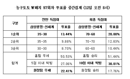 오리온그룹 계열의 스포츠토토 공식 온라인 발매사이트인 베트맨(www.betman.co.kr)은 오는 13일(월) 오후 5시 용인실내체육관에서 개최되는 2010-2011 여자프로농구 삼성생명-신세계전을 대상으로 한 농구토토 W매치 97회차 투표율 중간집계 결과 전체 참가자의 51.44%가 삼성생명이 신세계에 우세할 것으로 전망했다고 밝혔다.