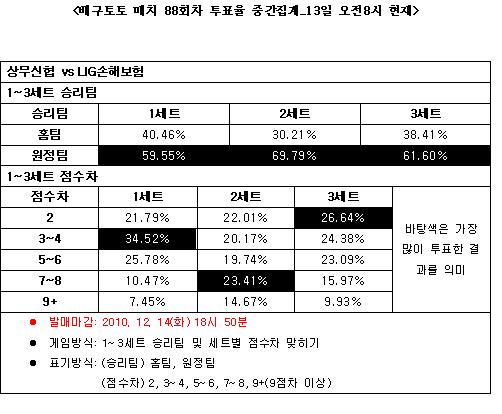 체육진흥투표권 수탁사업자인 오리온그룹의 스포츠토토 공식 온라인 발매사이트인 베트맨(www.betman.co.kr)은 오는 14일(화) 저녁 7시에 성남 실내체육관에서 열리는 2010-11시즌 국내프로배구 상무신협-LIG손해보험전을 대상으로 한 배구토토 매치 88회차 게임 투표율을 중간 집계한 결과, 국내 배구팬들은 LIG손해보험이 상무신협을 상대로 근소한 우세를 보일 것으로 예상했다고 밝혔다.