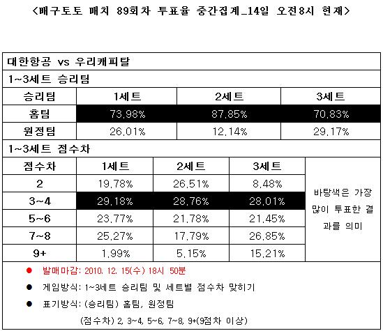 체육진흥투표권 수탁사업자인 오리온그룹의 스포츠토토 공식 온라인 발매사이트 베트맨(www.betman.co.kr)은 오는 15일 오후 7시 인천 도원체육관에서 열리는 대한항공-우리캐피탈전 대상의 배구토토 매치 89회차 게임 투표율 중간집계 결과, 국내 배구팬들은 대한항공의 압도적 승리를 예상했다고 밝혔다.