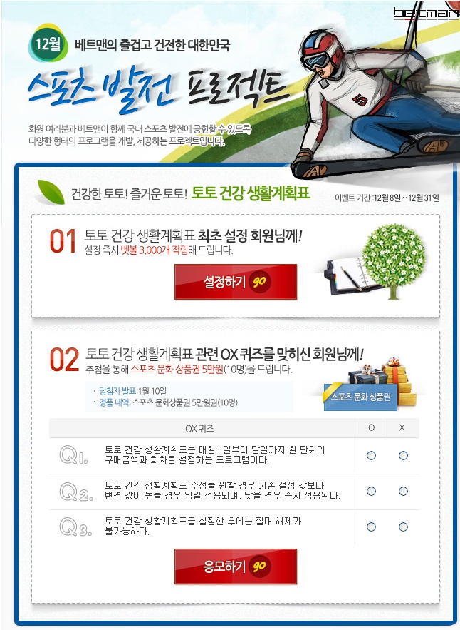'12월 스포츠발전 프로젝트'는 토토 건강 생활계획표를 설정하면 참여할 수 있고, 최초 설정 회원에게는 베트맨 홈페이지에서 사용할 수 있는 벳볼 3천개를 적립해준다. 또한 토토 건강 생활계획표 관련 OX 퀴즈를 맞히면 추첨을 통해 스포츠 문화상품권(10명)도 제공한다.