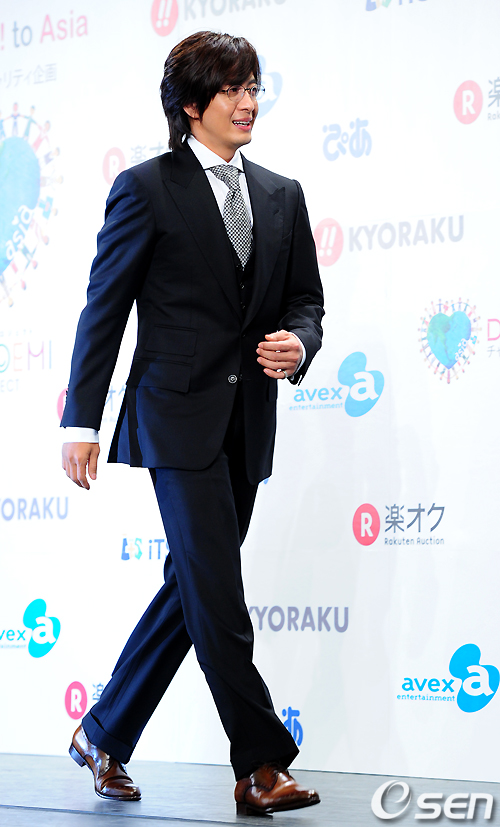 배우 배용준이 14일 오후 일본 도쿄 JCB홀에서 열린 DATV 자선기획 '미소 프로젝트' 1탄 '메시지 투 아시아(Message to Asia)' 공식 포토세션 행사에 참석해 포즈를 취하고 무대를 나서고 있다.