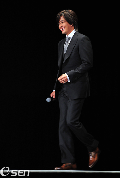 배용준이 14일 오후 일본 도쿄 JCB홀에서 열린 DATV 자선기획 '미소 프로젝트' 1탄 '메시지 투 아시아(Message to Asia)' 공식 포토세션 행사에 참석해 무대에 오르고 있다.
