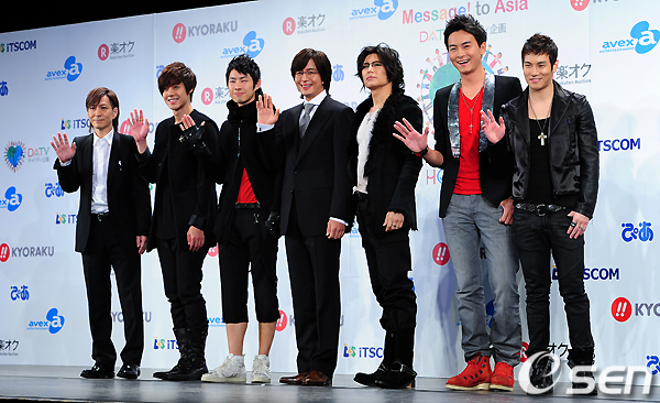 코무로 테츠야, 김현중, 바네스, 배용준, 각트, 정원창, 환희가 14일 오후 일본 도쿄 JCB홀에서 열린 DATV 자선기획 '미소 프로젝트' 1탄 '메시지 투 아시아(Message to Asia)' 공식 포토세션 행사에 참석해 포즈를 취하고 있다.