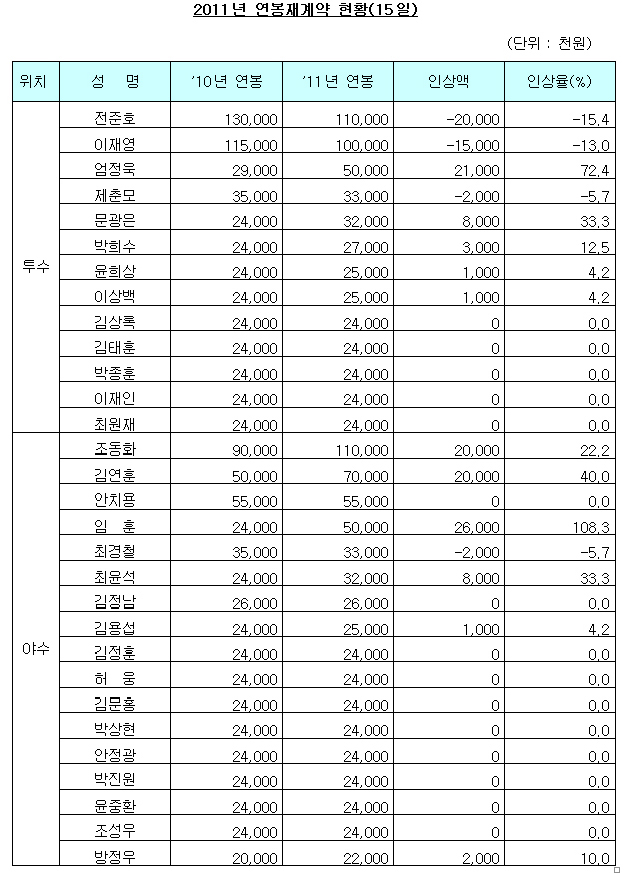 또한 올 시즌 재활에 성공한 우완투수 엄정욱도 4승 3패 67탈삼진 평균자책점 6.27을 기록, 2900만 원에서 72.4% 인상된 5000만 원에 재계약을 맺었다.