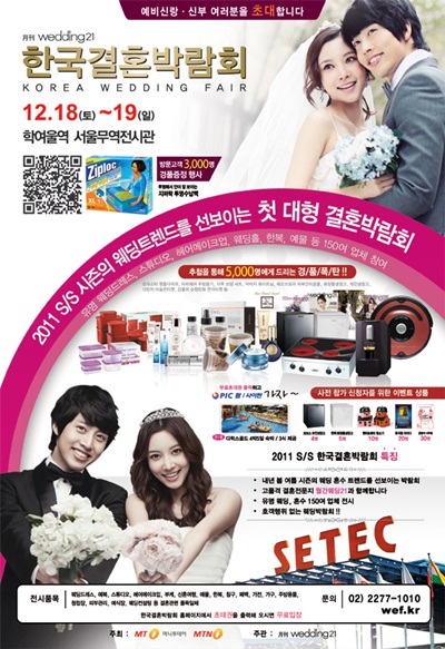 [데일리웨프/OSEN=정현혜 기자] '2011 S/S 한국결혼박람회 명품전' 이 오는 12월 18일에서 19일까지 학여울역에 위치한 SETEC(서울무역전시관)에서 머니투데이가 주최, 결혼전문지 '월간웨딩21' 주관으로 개최된다.