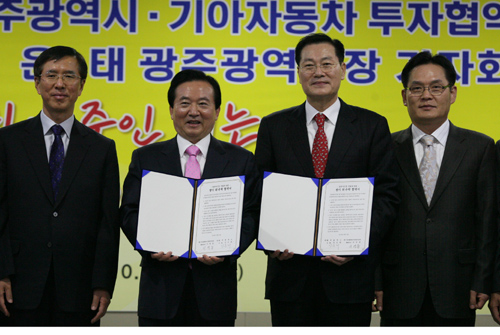 <사진 1>15일 광주광역시청 소회의실에서 광주 신구장 건립을 위한 투자협약식을 가졌다. 왼쪽부터 송귀근 행정부시장, 강운태 시장, 서영종 KIA 자동차 대표이사, 김조호 KIA 타이거즈 단장.