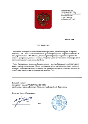 지난 3년여 동안 세계 여러 나라와 유수한 고흐 전문가들은 이 작품을 놓고 진위 여부를 은밀하게 조사해 온 것으로 알려졌다. 그 결과 방사성탄소연대측정법까지 동원한 러시아 국가내각위원회를 비롯, 모두가 “진품이 확실하다”는 결론을 내렸다고 한다. “고흐의 유작이 한국에 있을 리가 없다”며 믿지 않으려 했던 세계 미술계도 긍정의 분위기로 바뀌었다.