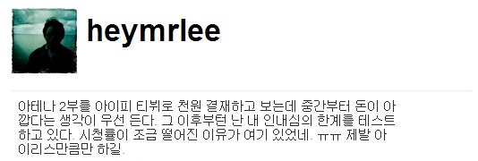 이 작가는 16일 오전 자신의 마이크로 블로그 트위터에 “‘아테나’ 2부를 IPTV에서 1000원 결재하고 보는데 중간부터 돈이 아깝다는 생각이 우선 든다"고 밝혔다.