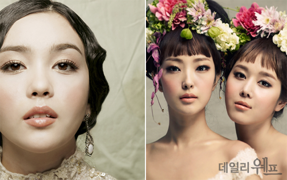 <티아라 바이 박은경>의 김승아 원장은 "골드와 연한 오렌지 색감의 섀도우를 눈두덩이에 골고루 펴바른 뒤 와인과 퍼플톤으로 위아래로 포인트를 주어 그라데이션 하면 눈매가 깊고 그윽해 보인다"며 "살굿빛 파스텔 톤으로 볼터치를 하고 입술에는 연한 오렌지와 핫핑크 글로스로 마무리하면 사랑스러운 웨딩 메이크업을 완성할 수 있다"고 전했다.