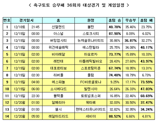 축구토토 승무패 36회차 게임은 오는 18일 오후 9시 35분에 발매가 마감되며, 결과는 모든 경기가 종료된 20일 발표된다.