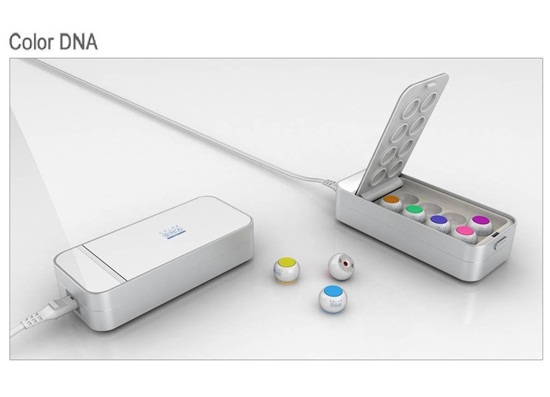 ‘칼라DNA’는 칼라 빛(Color Light)과 고대로부터 인체에 유익하다고 알려진 천연수정(Natural Quartz)의 고유한 특성을 이용해 피부에 부착할 수 있도록 만들어진 칼라 라이트 테라피 도구(Color Light Therapy Device)로 심플하고 앙증맞은 디자인으로 더욱 눈길을 끌고 있다.