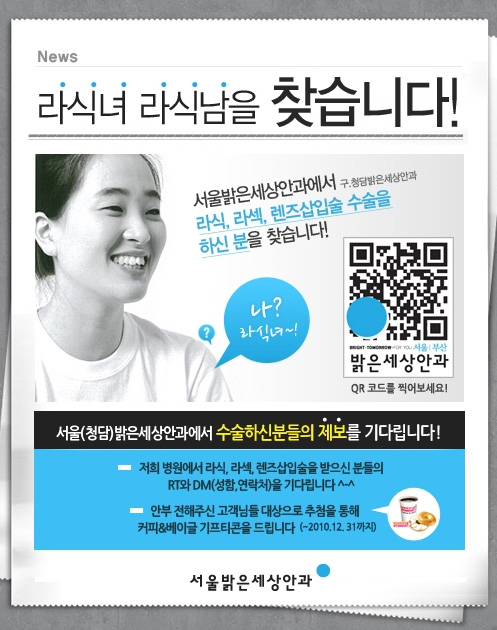 또한 병원에서 라식, 라섹, 렌즈삽입술을 받은 고객의 안부를 전해준 사람을 대상으로, 추첨을 통해 던킨도너츠의 커피와 베이글 기프티콘을 드리는 이벤트도 함께 진행한다. 트위터상의 큐알코드를 찍으면 더 자세한 정보를 얻을 수 있다.