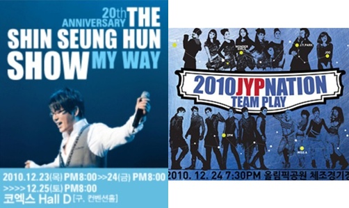 이와 함께 한국을 대표하는 핫한 아이돌 그룹을 한 무대에서 볼 수 있는 특별한 공연도 열린다. 바로 JYP 엔터테인먼트 사단이 준비한 ‘2010 JYP Nation ‘TEAMPLAY’’(이하 팀플레이)다. ‘팀플레이’는 국민 걸 그룹 원더걸스, ‘2010 MAMA’ 3관왕 등 최고의 한해를 보낸 Miss A, 아시아 대표 스타로 거듭나고 있는 2PM이 함께 한다는 소식만으로도 화제를 모은 콘서트로 댄스, 발라드, R&B 등 장르를 넘나드는 음악과 다양한 콜라보레이션을 즐길 수 있다. 23일 오후 7시 30분 서울 올림픽공원 체조경기장에서 개최된다.