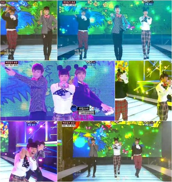 이들은 미키마우스 머리띠에 땡땡이 나비 넥타이, 체크무늬 바지 등 깜찍한 아이템으로 무장한 후, 오렌지캬라멜 특유의 웃음, 손동작, 안무 등을 완성도있게 재현했다.