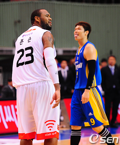 17일 오후 서울 잠실실내체육관에서 열린 '2010~2011 현대모비스 프로농구' 서울 삼성과 부산 KT의 경기, 경기종료 1분여를 앞두고 3점차로 뒤진 KT 존슨이 삼성 이규섭의 볼을 가로채고 패스미스를 범하자 아쉬워하고 있다. 반면 삼성 이규섭은 혀를 내밀며 안도의 한숨을 쉬고 있다. / jpnews@osen.co.kr
