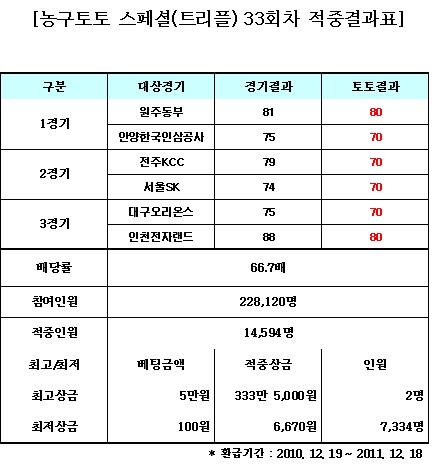 [농구토토] 2010-2011 프로농구 3경기를 대상으로 하는 농구토토 스페셜 33회차 게임(트리플)에서 총 14,594명의 적중자가 나왔다.