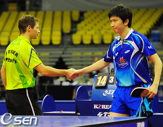 남자 단식 준결승에서 유승민(세계랭킹 16위)이 바슈티안 슈테거(독일, 세계랭킹 33위)와 경기에서 세트 스코어 4-2(8-11 11-8 12-14 11-7 3-11 12-14)로 패한 후 서로 악수를 나누고 있다./rumi@osen.co.kr