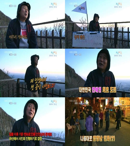 이날 이수근은 광주광역시 무등산 서석대에 올라 사인회를 열어 30명에게 사인을 해주는 미션을 받았다. 사인회를 위해 험한 무등산 등정에 올랐지만, 너무 추운 날씨와 해가 질 시간이라는 제약에 사인을 해줄 사람이 없었다.