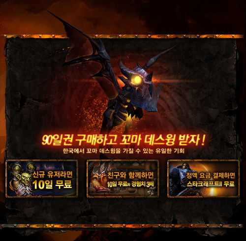 오픈 베타 서비스는 종료됐지만 블리자드 특유의 이벤트는 끝나지 않았다. 블리자드는 20일부터 내년 1월 31일까지 90일 정액 요금을 구매하는 게이머에게 본인의 WOW 계정에 등록된 모든 캐릭터에 애완동물 ‘꼬마 데스윙’을 증정하는 이벤트를 진행한다. 이번 이벤트는 대격변에 절대악으로 등장하는 데스윙의 애완동물 버전인 ‘꼬마 데스윙’을 한국에서 받을 수 있는 유일한 기회다.