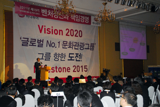 하나투어는 지난 10일(금) 그랜드힐튼 호텔에서 박상환 회장과 권희석 사장을 비롯한 해외지사장 및 주재원, 자회사 임원 등 350여 명의 팀장급 이상 임직원들이 참가한 가운데 '2020년 글로벌 NO.1 문화관광그룹'이라는 새로운 비전을 선포했다.
