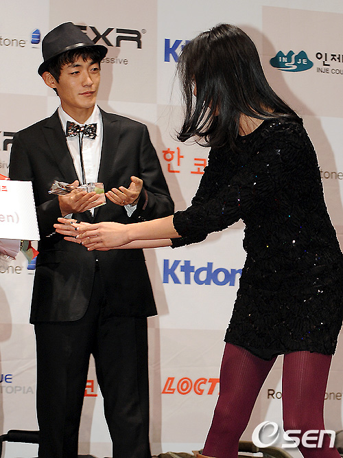 레드앤스피드 한민관이 신인상을 수상한 뒤 이화선에게 꽃을 요구하고 있다 /soul1014@osen.co.kr