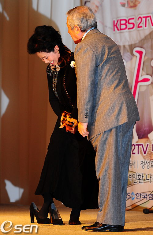 선우용여가 송재호와 키를 맞추기 위해 포토타임을 갖으며 구두를 벗고 있다. /jpnews@osen.co.kr