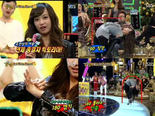 빅토리아는 21일 방송된 SBS '강심장'에서 손가락을 반대편으로 180도 획 젖히는 모습을 보여줬다.