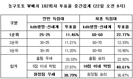 원정팀 신세계의 승리에 투표한 참가자는 36.47%로 집계됐고, 나머지 22.92%는 홈팀 kdb생명의 승리를 내다봤다.