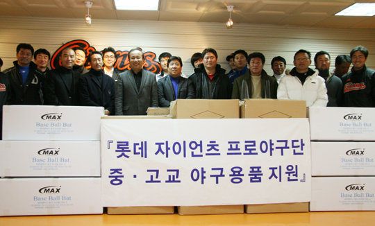 롯데 자이언츠는 23일 오후 2시 부산 사직구장에서 부산, 울산, 경남 연고지역 아마야구팀 야구용품 전달식을 가졌다.