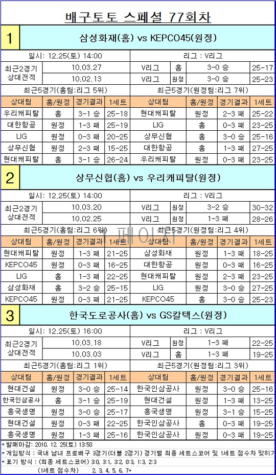 1~3세트 승리팀과 점수차를 알아맞히는 배구토토 매치 게임에서 세트별 예상 승리팀은 1세트(79.66%), 2세트(80.80%), 3세트(77.93%) 모두 삼성화재로 나타났다.