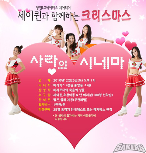 창원지역 시설 아동들을 초청하여 경기를 보며 응원을 하고 경기 후에는 시네마 행사에 참여하는 팬들과 함께 메가박스에서 '해리포터와 죽음의 성물' 영화를 관람한다. 영화 관람 동안 세이퀸들이 음료와 팝콘등을 제공하며 행사에 참가한 팬들의 이웃돕기 성금을 모아 전달한다.