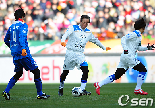 사랑팀 정몽준 대한축구협회 명예회장이 여민지에게 패스하려하고 있다 . /rumi@osen.co.kr