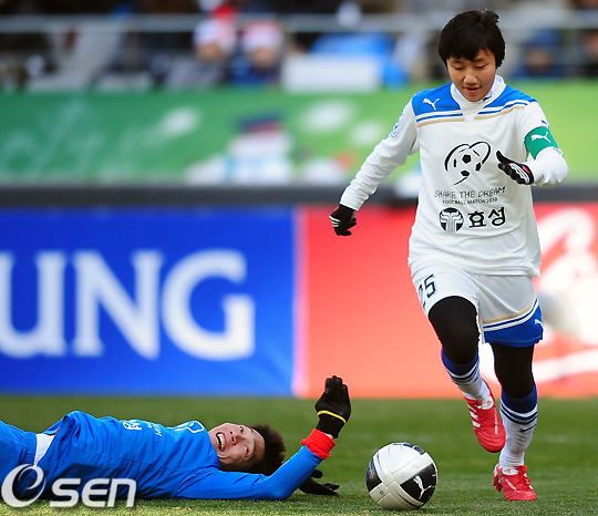 사랑팀 여민지가 희망팀 김형일을 돌파하고 있다. /rumi@osen.co.kr