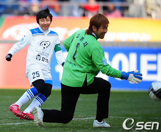 희망팀 여민지가 김병지 골키퍼를 똟고 슛을 성공시키고 있다. /rumi@osen.co.kr