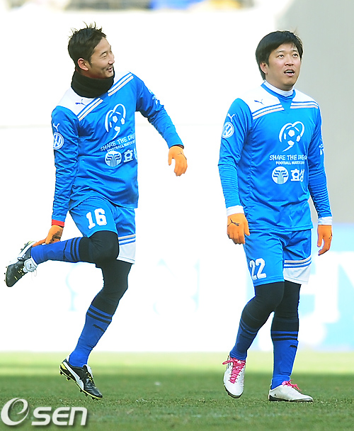 희망팀 고종수 슛을 성공시킨 후 세리머니를 하지 않자 이천수가 다가와 얘기를 하고 있다./rumi@osen.co.kr