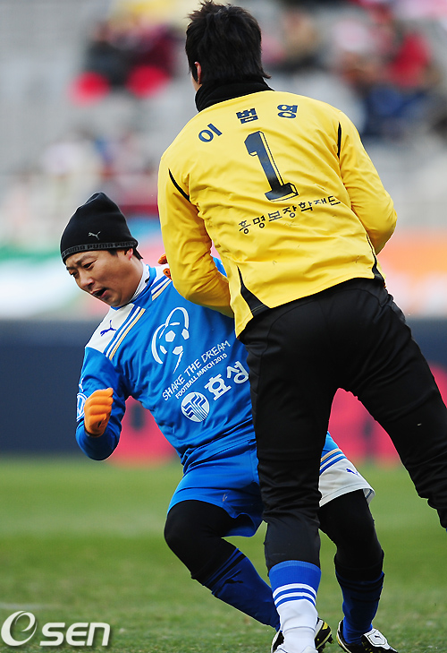 희망팀 이수근이 사랑팀 골키퍼 이범영과 몸싸움을 하고 있다./rumi@osen.co.kr