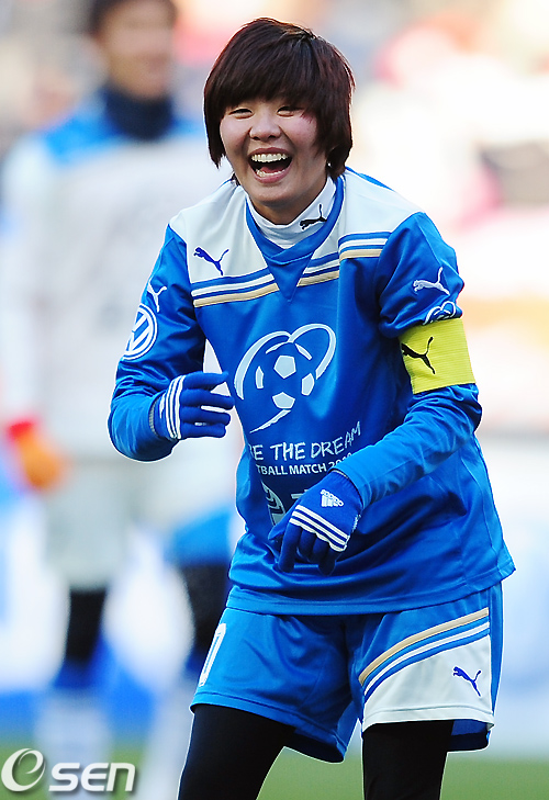희망팀 지소연의 슛이 사랑팀 골키퍼 이범영에게 계속 막히자 지소연이 환하게 웃고 있다./rumi@osen.co.kr
